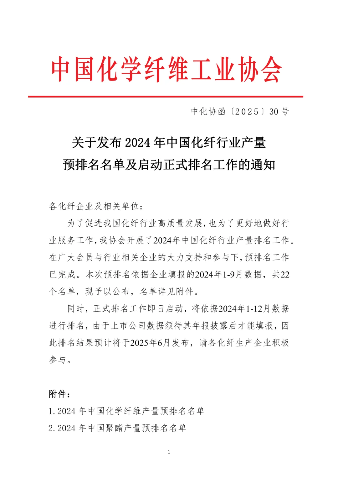 为了促进我国化纤行业高质量发展,也为了更好地为行业服务,中国化学纤维工业协会于2024年继续开展了中国化纤行业产量排名工作。在广大会员与行业相关企业的大力支持和参与下,2024年预排名工作已完成。本次排名根据2024年1-9企业填报数据,分为化学纤维产量综合排名以及21个细分产品产量排名,现予以公布。