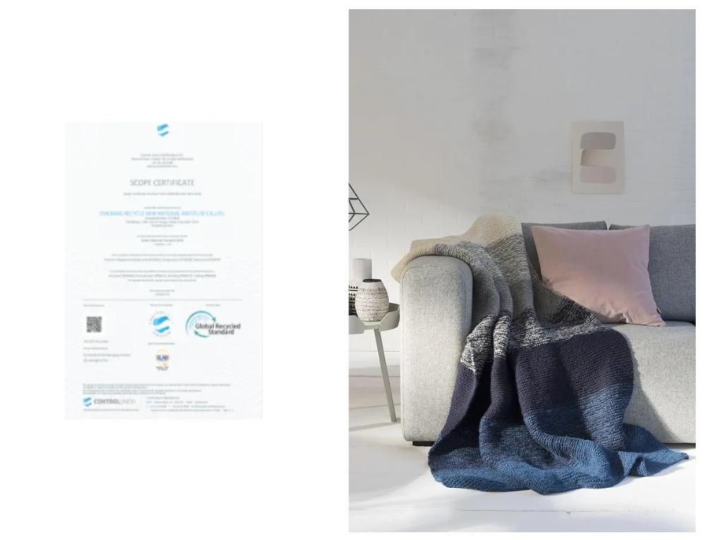 产品特性:采用废旧聚酯瓶片作为原材料,经过造粒、熔融纺丝,是一种新型的环保再生产品,符合GRS认证要求。